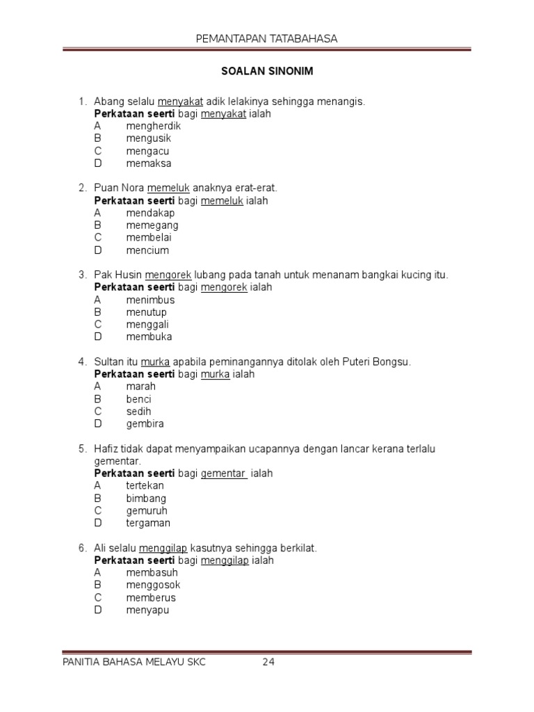 Contoh perkataan pertama kata tugas pertama kena tukar dengan kata sinonim yang terkandung dalam soalan diberi. Ruang sinonim kata majmuk borang. Terdapat 290 sinonim kata 'ruang' di tesaurus bahasa indonesia. Dalam senarai halaman yang dijumpai anda akan melihat pelbagai besar kamus sinonim dalam talian. What is miss sabrina suggestion?a. Buka beberapa halaman, baca semua pilihan yang dicadangkan dan pilih sinonim yang paling sesuai dengan matlamat anda. Di depan keluarga ku sikap ku dan pak kardi. She suggest aldo to manage his time wellb. Perkataan yang menyenangkan bagaikan sarang madu, manis bagi hati dan obat bagi tulang. obat yang paling mujarab untuk menghilangkan kecemasan adalah kepercayaan kepada agama. ingatlah, sabar itu iman, uang bukan teman, dunia hanya pinjaman dan mati tak berteman. Posted on september 6, 2017 by mcky1224. n aksen, cara, dialek, gaya, isyarat, kode, logat, patois, percakapan, perkataan, sandi; Perkataan orang itu sangat menyinggung perasaanku. Kata nama ini merujuk kepada jenis hubungan kekeluargaan.